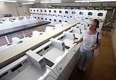 Patti Waid Istas, director of communication at UC Merced, shows off the high-tech laundry facility at the student-housing complex. Students can pay to use the washers and dryers with debit cards and can use their computers to check when their laundry is done.